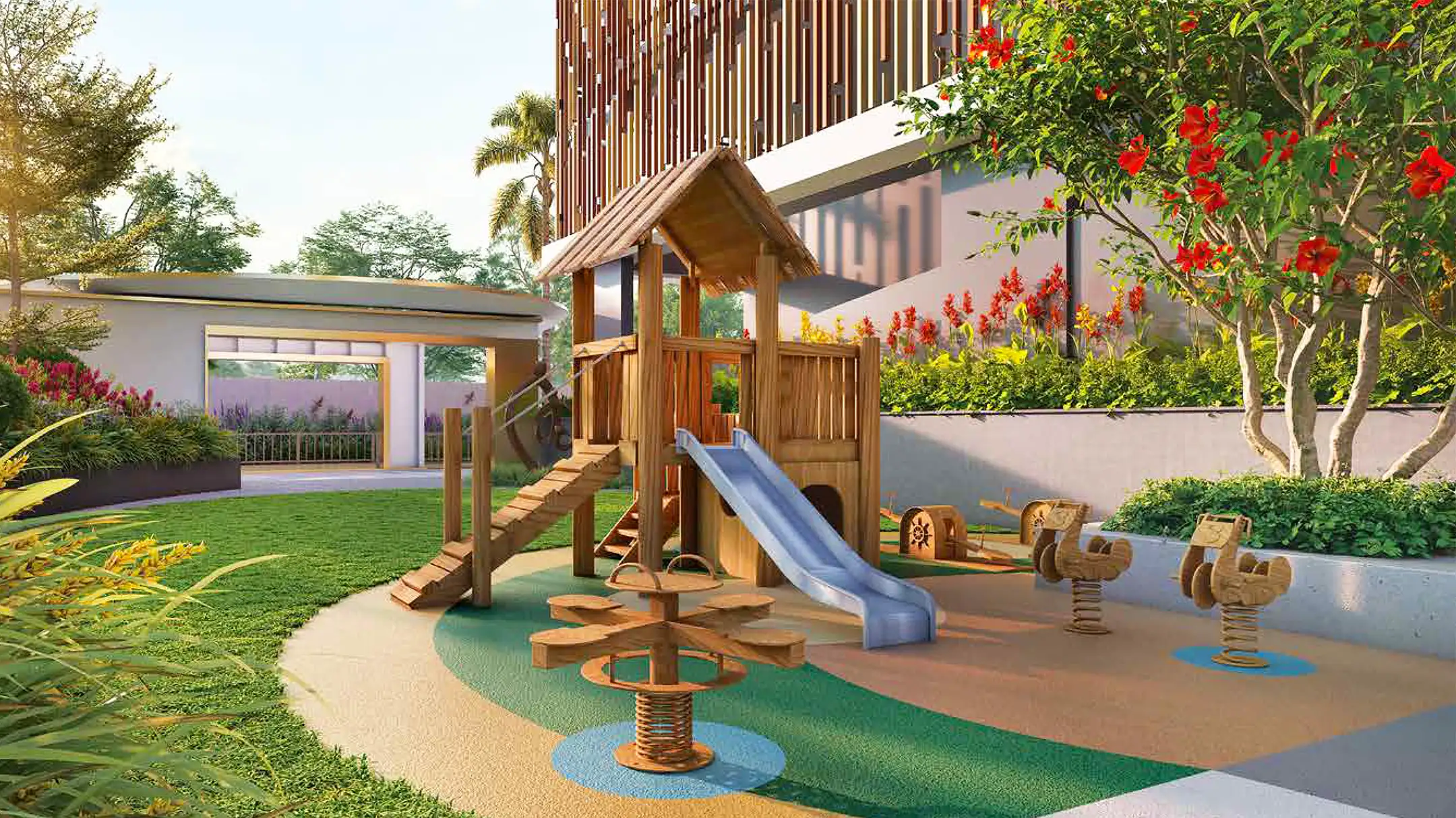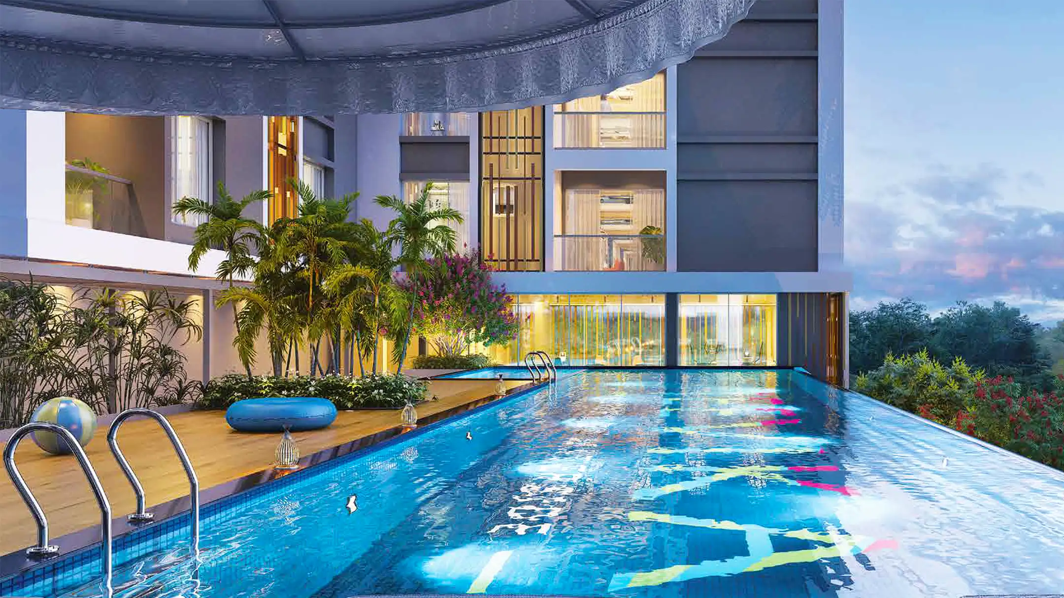 Enjoy resort-style amenities at Jeevika, including a swimming pool, gym, mini theatre, banquet hall, yoga deck, reflexology path, jogging track, kids’ play zone, amphitheatre, senior seating, and lush water-inspired open spaces.